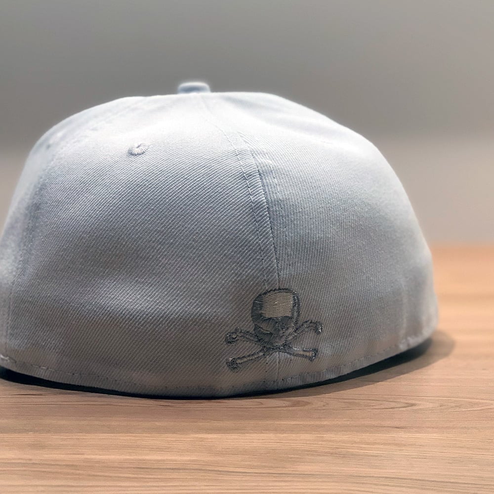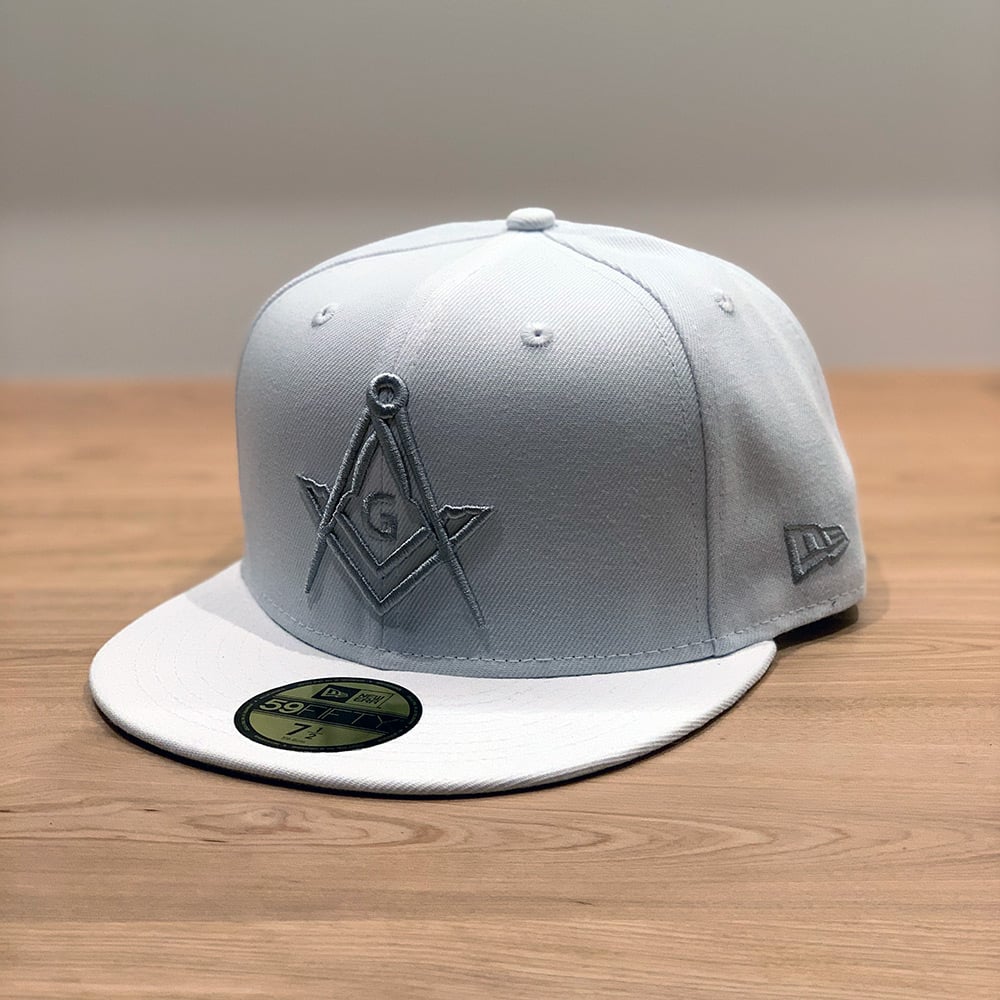 All white crown, visor, and button. Front embroidery features the Square & Compass with G in a light grey raised embroidery. The side NE flag is also in light grey, and on the back is the memento mori skull in light grey. To complete the clean finish, the undervisor is in a matching light grey.
